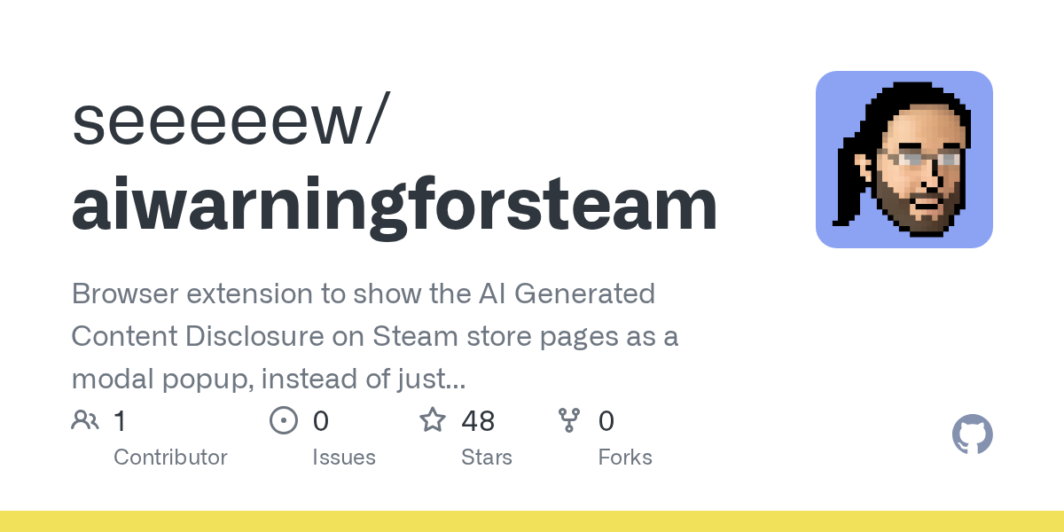 arrow-up138arrow-down1external-linkBrowser extension to show the AI Generated Content Disclosure on Steam store pages as a modal popup, instead of just at the end of the page. - GitHub - seeeeew/aiwarningforsteamplus-squaregithub.comA Mouse@midwest.socialEnglish · 23 days agomessage-square0linkfedilink