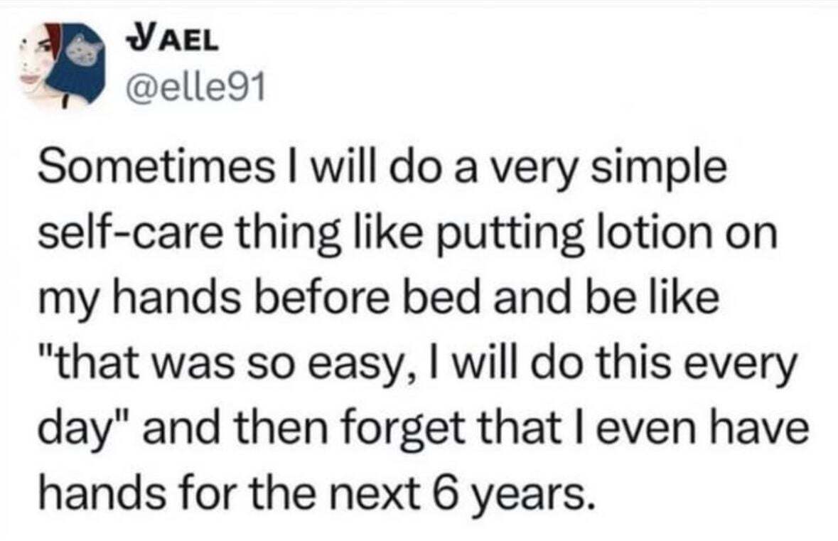This only works for normies. No matter how hard I try to set a habit, ADHD-induced executive disfunction comes knocking on the door and reminds me why I can’t have nice things.