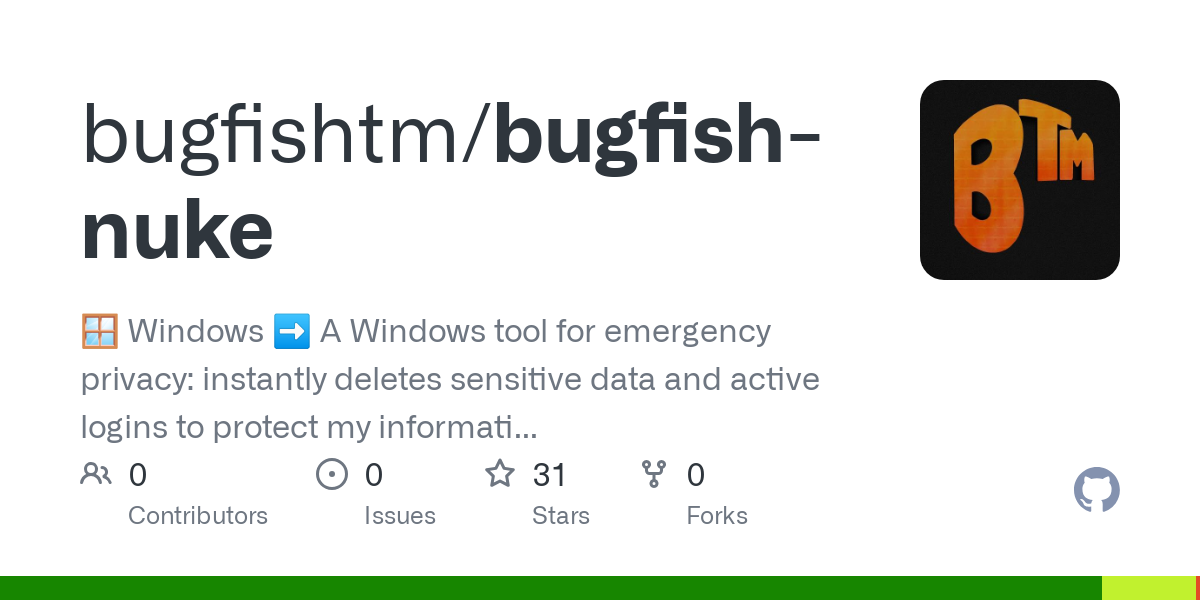 arrow-up170arrow-down1external-linkGithub - bugfishtm/bugfish-nuke: A Windows tool for emergency privacy: instantly deletes sensitive data and active logins to protect my information during unexpected searches or house warrants.github.comTablaste@linux.community to Privacy@lemmy.mlEnglish · 7 months agomessage-square25linkfedilinkcross-posted to: privacy@lemmy.ca