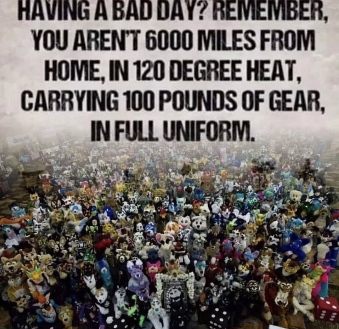 Ah, I see your argument. There’s a non-zero chance of a fursuit being covered in… fluids, so to avoid ever coming in contact, you avoid all fursuits.