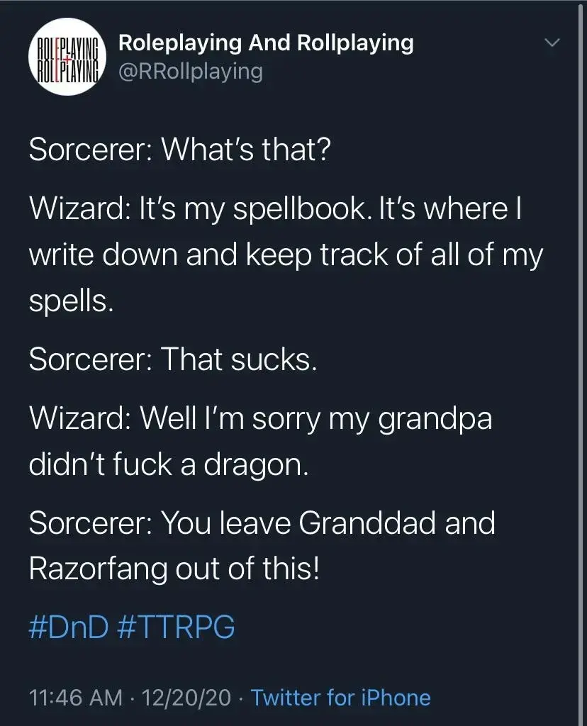 arrow-up1356arrow-down1imageThe Wizard and Sorcerer beef continueslemmy.dbzer0.comStamets@lemmy.dbzer0.com to RPGMemes @ttrpg.network · 14 days agomessage-square8linkfedilink