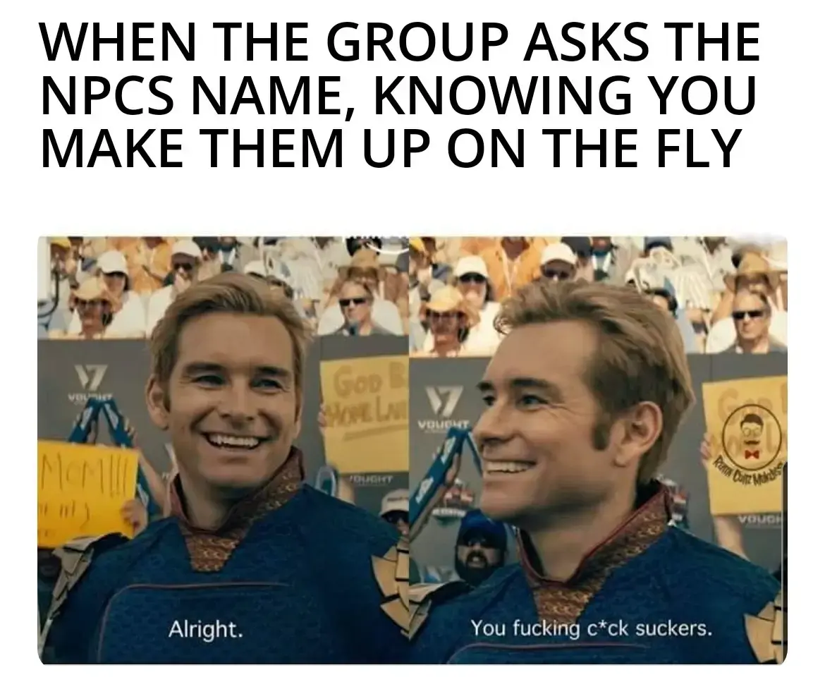 minus-squaresirblastalot@ttrpg.networklinkfedilinkarrow-up24·10 days agoprotip: don’t cross them off, write who they are on the list (eg “Rivermeadow blacksmith”) so you can remember when the players come back to them a million sessions later