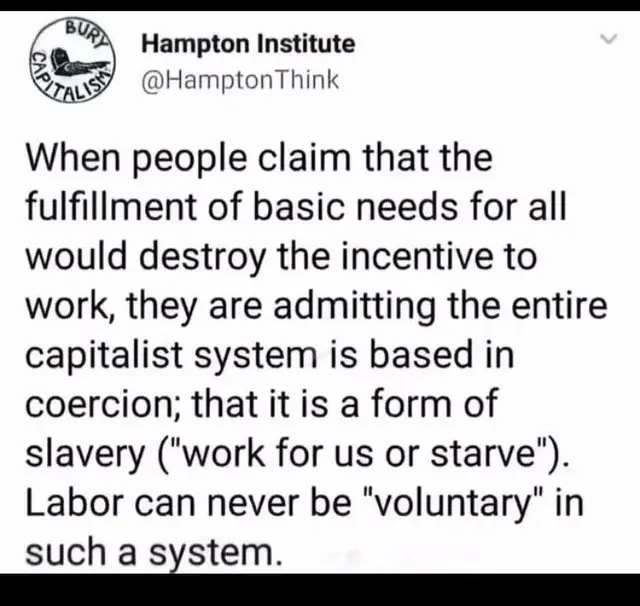 The premise is that without coercion people won’t work. Which is just not true, people will do the work they want to do. It’s just that the work people want to do isn’t necessarily the work capitalists want them to do. Which means less exploitation and profit for the capitalists.
