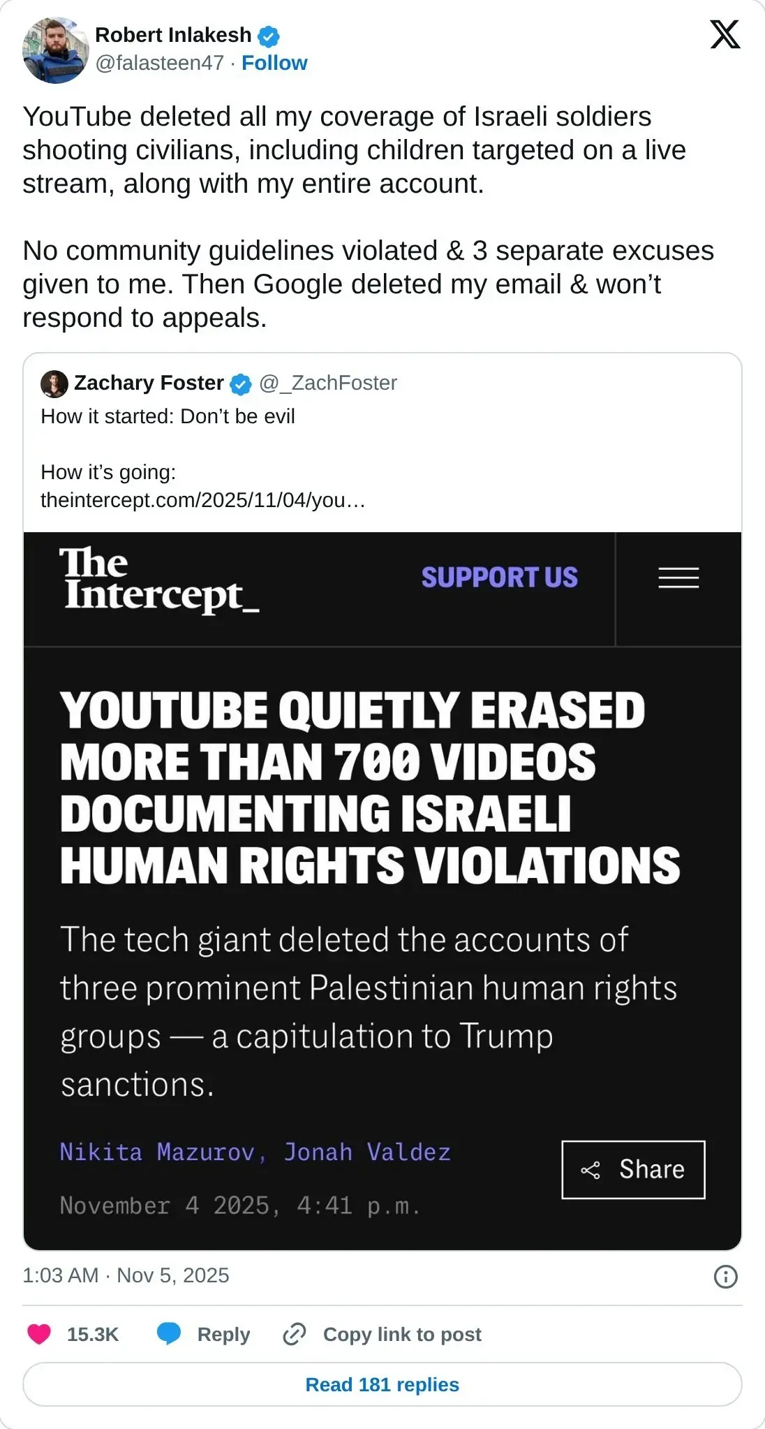 arrow-up11.19Karrow-down1imageYouTube deleting videos documenting Israeli human rights violationslemmy.blahaj.zoneInterstellar_1@lemmy.blahaj.zone to Microblog Memes@lemmy.worldEnglish · 10 days agomessage-square75linkfedilink cross-posted to: aboringdystopia@lemmy.world