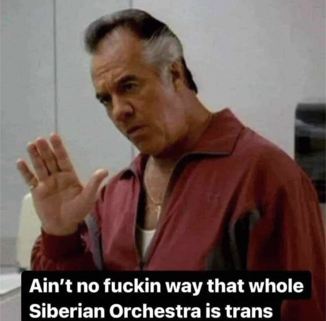 It’s a reference to the Trans-Siberian Orchestra, the joke being a misunderstanding of this use of the word Trans to be short for transexual, when in this context it’s actually meant to modify Siberian, as the band’s name is a reference to the Trans-Siberian railway.